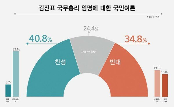 리얼미터 조사에서 김진표 총리 임명 찬성이 40.8% 반대가 34.8%로 팽팽해보이지만, 응답자 중 40% 정도를 차지하는 중도층에서 찬성 여론이 45.5%로 반대 32.2%보다 크게 높았다. 그리고 대통령 지지여부, 정당지지, 연령, 성별 등 여러 척도에서 찬성 의견이 고르게 높다.