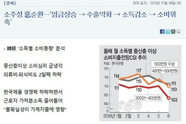 그럼에도 불구하고 작년 내내 수출 부진에 대한 잘못된 분석과 기사들이 넘쳐났다. 일부 언론에서는 문재인 정부가 ‘수출주도성장’이 아닌 ‘소득주도성장’을 추진했기 때문이라고 비난하는가 하면 ‘소주성 惡순환…임금상승 → 수출악화 → 소득감소 → 소비위축’(문화일보 2019. 7.8)의 이상한 도식으로 최저임금 상승과 소득주도성장정책을 수출악화의 원흉으로 지목하고 싸잡아 비난하기도 했다.