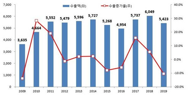 그래서 2019년 우리 수출은 연간 5423억달러로 수출증가율은 전년 대비 무려 –10.3% 하락한 것으로 나타났고, 2009년 금융위기 이후 최악의 수출 실적이라는 비난이 끊이지 않았다.
