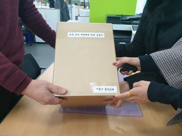 조국 교수의 직위해제를 반대하는 55,166명의 서명부가 21일 오후 3시 서울대 교무처에 전달됐다. 인터넷 닉네임 마리아님을 비롯해 이 서명운동에 참여한 세 명의 시민은 A4 용지 한 페이지에 106명씩 523페이지로 출력한 서명부와 성명서를 서울대 교무처에 전달했다.
