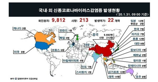 - 중국 우한 198명, 베이징 5명, 광동성 14명, 상해 1명 ▲ 태국 2명 ▲ 일본 1명