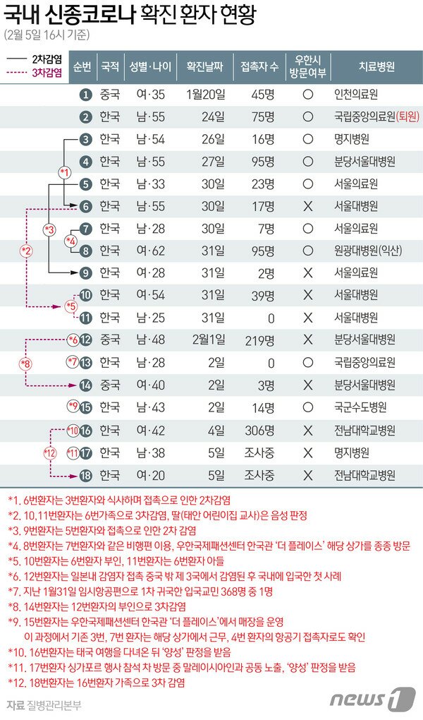 한편 질병관리본부는 이 날 17번 환자와 18번 환자가 추가 감염자로 확인되면서 국내 확진자는 총 18명으로 늘었다고 밝혔다. 현재까지 522명이 격리해제됐고, 174명은 검사 중이다.
