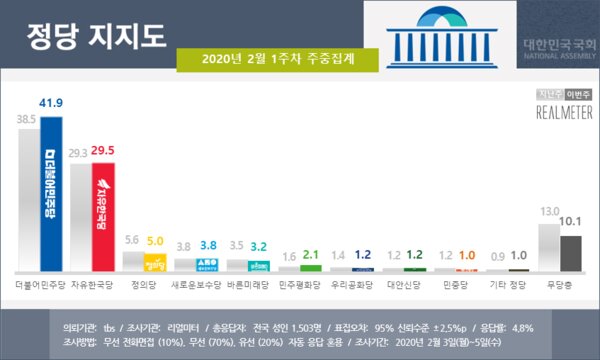 6일 여론조사 전문기관 리얼미터가 tbs 의뢰로 지난 3~5일 전국 만 18세 이상 유권자 1503명을 대상으로 실시한 2월1주차 주중동향에 따르면, 더불어민주당 지지율은 전주 대비 3.4%p(포인트)오른 41.9%로 집계됐다. 지난주 대비 오차범위 밖에서 상승하며 2주만에 40%선을 회복했다.