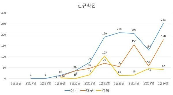 질병관리본부 중앙방역대책본부(본부장 정은경)는 2월 26일 09시 현재, 전일 16시 대비 확진환자 169명이 추가로 확인되었다고 밝혔다. 전일 9시 대비로는 253명이다. 이는 현재까지 1일 확진자 최대치다.