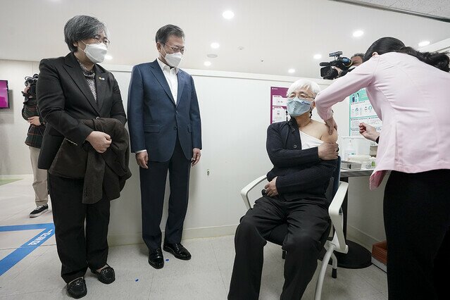 | ▲문재인 대통령이 2월 26일 서울 마포구보건소를 방문, 재활시설 종사자인 김윤태 의사(푸르메넥슨어린이재활병원장)가 아스트라제네카(AZ) 백신을 접종받는 모습을 지켜보고 있다./청와대 제공 |