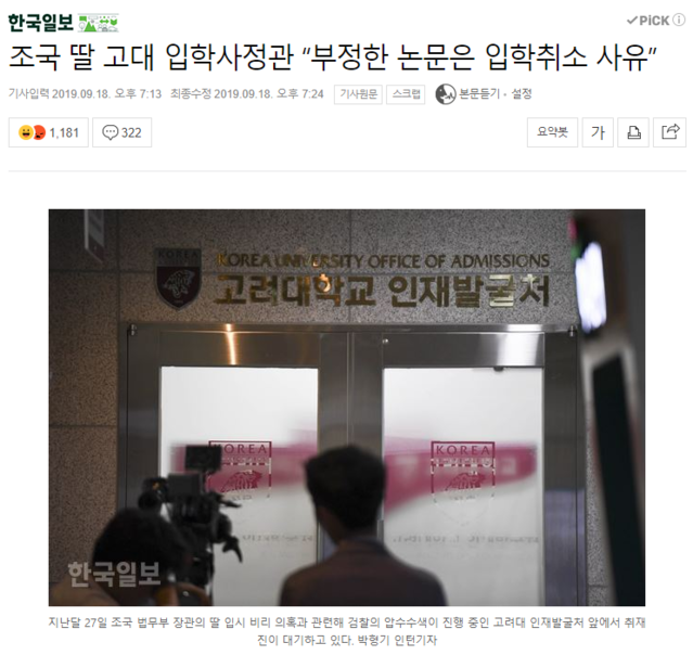 한국일보 안하늘·김영훈 기자는 유일하게 고려대로 직접 찾아가 지 교수를 만나 얘기를 들었다. 한국일보는 9월 18일 기사에 <조국 딸 고대 입학사정관 “부정한 논문은 입학취소 사유”>라면 무시무시한 제목을 달았지만, 기사에는 “지 교수도 목록표가 고려대에서 나오지 않았다는 사실을 알고 있었다”는 검찰의 주장이 허위라는 사실을 입증하는 내용이 담겨 있다.