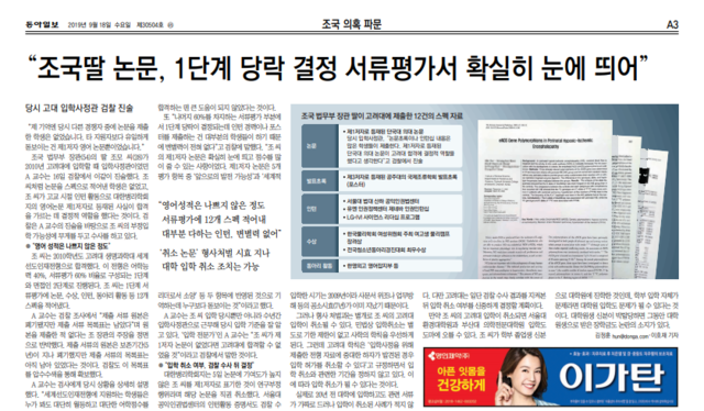 논문 제출과 관련된 허위 과장 보도의 압권은 동아일보였다. 동아일보 김정훈 기자는 9월 18일 <“조국딸 논문, 1단계 당락 결정 서류평가서 확실히 눈에 띄어”> 기사에서 ‘뇌피셜’의 전형을 보여주었다.