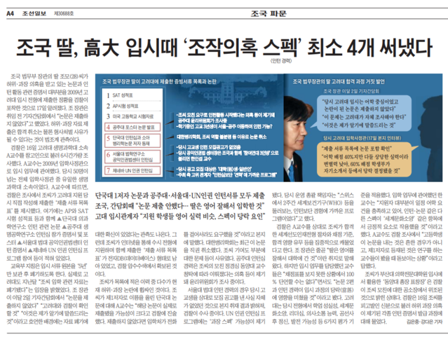 조선일보는 여기에서 한 걸음 더 나갔다. 조선일보 김은중 기자는 9월 18일 <조국 딸, 高大 입시때 '조작의혹 스펙' 최소 4개 써냈다> 기사에서 “조씨가 인터넷을 통해 수시 전형에 지원하며 함께 제출한 '제출 서류 목록표'가 전자DB(데이터베이스) 형태로 남아 있었고, 검찰 압수수색에서 확보된 것”이라고 보도했다.