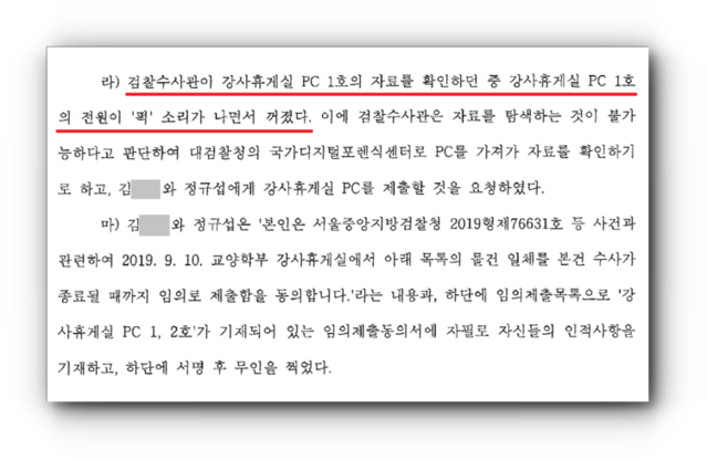 검찰은 2019년 9월 10일 동양대 인문학부 강사휴게실에서 발견된 PC 두 대를 임의 제출 받으면서 “(주 증거가 되는) 강사휴게실 PC 1호의 자료를 확인하던 중 전원이 ‘퍽’ 소리가 나면서 꺼졌다”며 “자료 탐색이 불가능하다고 판단하여 대검 국가디지털 포렌식 센터로 가져가 자료를 확인하기로 하고 김 조교와 정규섭에게 PC를 제출할 것을 요청했다”고 주장했고, 재판부는 이 주장을 받아들여 형사소송법 제106조 3항에 따라 “전자정보의 저장매체인 강사휴게실 PC를 임의제출 받은 것은 적법하다”고 판시했다.