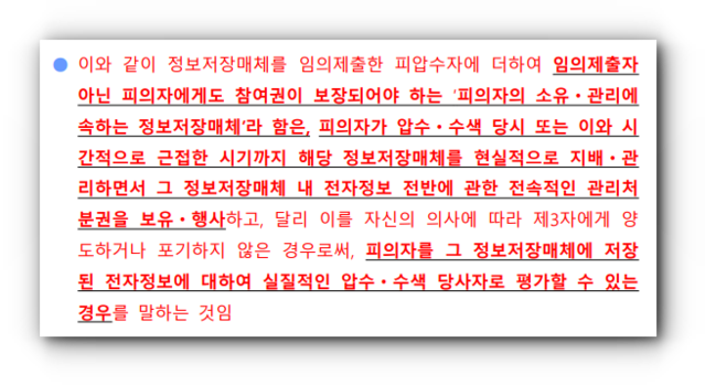 대법원은 "피압수자에 더하여 임의제출자 아닌 피의자에게도 참여권이 보장되어야 하는 ‘피의자의 소유ㆍ관리에 속하는 정보저장매체"에 대해 ▲피의자가 압수ㆍ수색 당시 또는 이와 시간적으로 근접한 시기까지 해당 정보저장매체를 현실적으로 지배ㆍ관리하면서 그 정보저장매체 내 전자정보 전반에 관한 전속적인 관리처분권을 보유ㆍ행사하고 ▲달리 이를 자신의 의사에 따라 제3자에게 양도하거나 포기하지 않은 경우로 정의했다.
