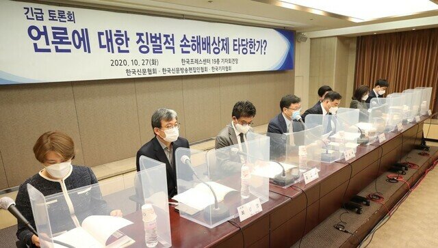 | ▲ 2020년 10월 27일 서울 중구 프레스센터 기자회견장에서 한국신문협회, 한국신문방송편집인협회, 한국기자협회 등 언론3단체가 주최한 '언론에 대한 징벌적 손해배상제 타당한가?' 긴급토론회가 열리고 있다. |