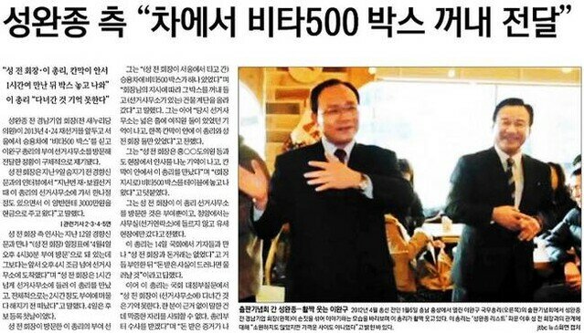 경향신문은 2015년 4월 성완종 전 의원이 사망 전 “지난번 재·보궐선거 때 이 총리의 선거사무소에 가서 한나절 정도 있으면서 이완구 총리에게 3000만원을 현금으로 주고 왔다”는 말을 남긴 것과 관련, “성 전 의원 측이 2013년 4월 4일 오후 4시 30분 이완구 총리의 부여 선거사무소에서 비타500박스를 전달했다”고 보도했다.