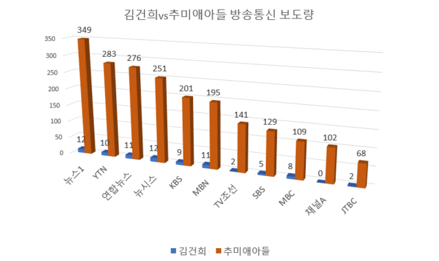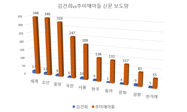 이 매체들은 김건희 보도는 채널A의 0건에서부터 적게는 2건에서 많게는 세계일보의 17건 정도였으나, 추미애 아들 휴가 건은 가장 적게 보도한 한겨레의 55건에서 가장 많이 보도한 뉴스1의 349건에 이르렀다.
