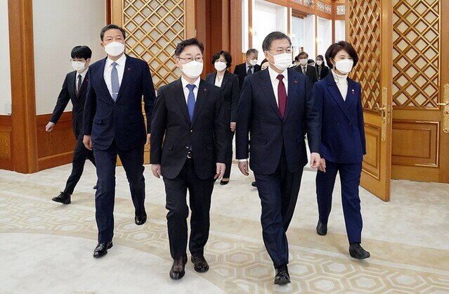 | ▲ 2021년 1월 29일 문재인 대통령이 박범계 법무부 장관 등 신임 장관에 대한 임명식을 마친 뒤 함께 걸어나오고 있다/ 청와대 제공 |