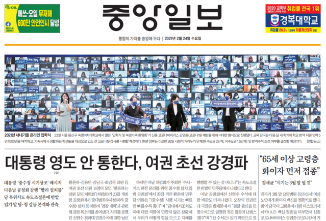 특히 중앙일보는 법무부에 대한 대통령의 지시와 여당이 주최한 검찰개혁 공청회를 엮어 ‘레임덕 신호’로 연결시킨 <대통령 영도 안 통한다, 여권 초선 강경파> 기사를 24일 지면의 1면 톱으로 올렸다.