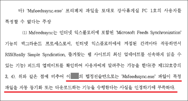 | ▲ 검찰의 Msfeedsync 동기화 프로그램 주장을 기각한 1심 판결문 |