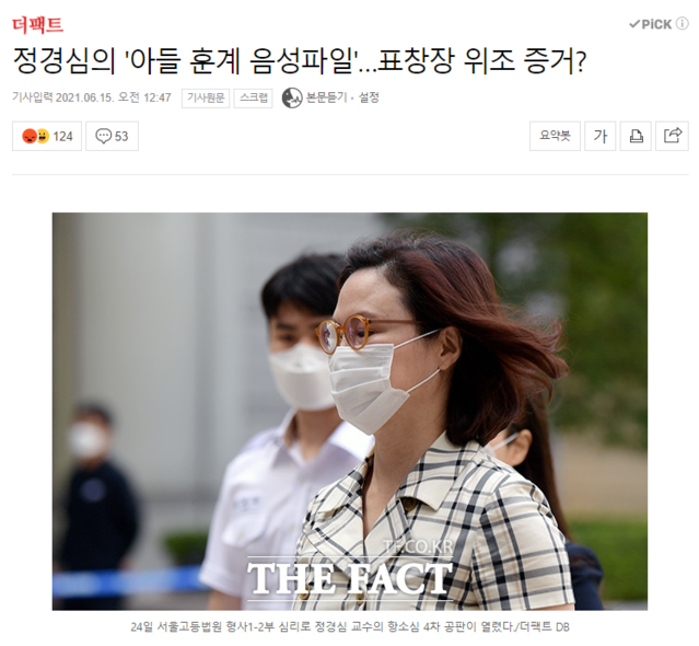 이는 육성이 담긴 녹음 파일 자체가 기본적으로 자극적인 데다가, 정 교수의 화난 목소리가 담겨 있고, 더 나아가 ‘결정적인 증거’로서의 선입관을 주기 때문이다. <더팩트>의 경우 검찰이 말하지도 않은 “표창장 위조 증거?”라고 제목을 달아 이 녹음 파일이 사건의 핵심인 ‘표창장 위조’의 증거까지 되는 것인 양 보도하기도 했다.