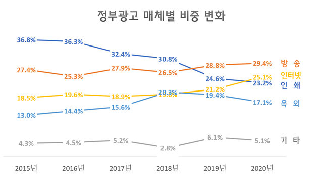 정부 광고의 인쇄매체 비중은 박근혜 정부 시절이었던 2015년 36.8%, 2016년 36.3%로 부동의 1위를 차지하며 큰 변화가 없다가 문재인 정부가 출범한 2017년 32.4%로 떨어진 뒤 그 이후 크게 떨어져 2018년 30.8%, 2019년 24.6%, 2020년 23.2%로 떨어졌다. 2016년을 기준으로 하면 13.1%p 하락한 것이다.