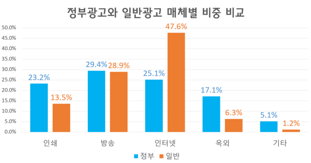 2020년 정부 광고의 인쇄매체 비중이 23.2%인 데 반해 일반 광고시장의 인쇄매체 비중은 13.5%에 불과하고, 정부 광고에서의 비중이 25.1%에 불과한 인터넷 광고는 일반 광고시장에서는 절반에 육박하는 47.6%에 달했다.