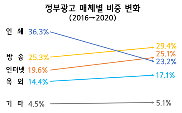 정부 광고의 인쇄매체 비중이 2016년 36.3%에서 2020년 23.2%로 크게 감소한 것으로 나타났다. 금액으로는 2016년 2243억원에서 2020년 2457억원으로 조금 늘었다.