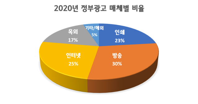 정부광고를 대행하고 있는 한국언론진흥재단에 따르면 2020년 정부광고 집행 규모는 총 1조 609억원으로 이 중 방송 광고가 3122억원 29.4%로 가장 많고, 인터넷 광고가 2668억원 25.1%로 그 뒤를 이었으며, 신문을 포함한 인쇄매체 광고가 2457억원 23.2%, 옥외 광고가 1815억원 17.1%, 기타 546억원 5.1% 순이었다.