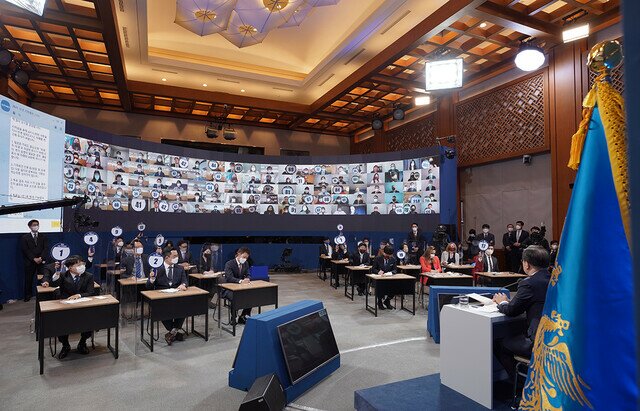 안녕하세요. SBS 정경윤 기자입니다. 조금 전 정만호 수석님 말씀하신 대로 기자회견 이곳 현장에서 그리고 온라인으로 참여하지 못한 청와대 출입기자들이 160명 정도 됩니다. 이 기자들이 지금 제 오른쪽에 보이는 온라인 채팅창에서 질문들을 계속 올려주고 있었는데요. 기자회견 동안 나오지 않았던 질문들, 이 문제는 꼭 대통령의 생각을 들어보고 싶다. 혹은 추가 질문이 있다, 이런 내용들을 계속 올려줬습니다.