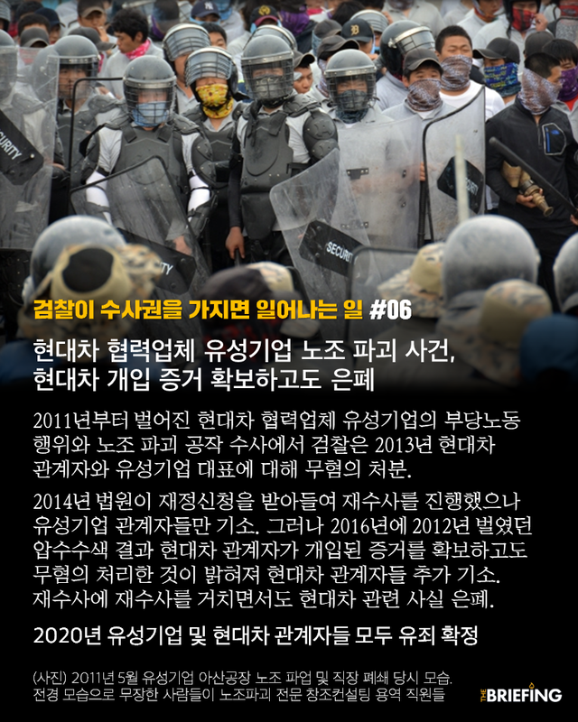 2011년부터 벌어진 현대차 협력업체 유성기업의 부당노동행위와 노조 파괴 공작 수사에서 검찰은 2013년 현대차 관계자와 유성기업 대표에 대해 무혐의 처분.