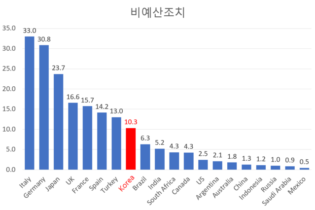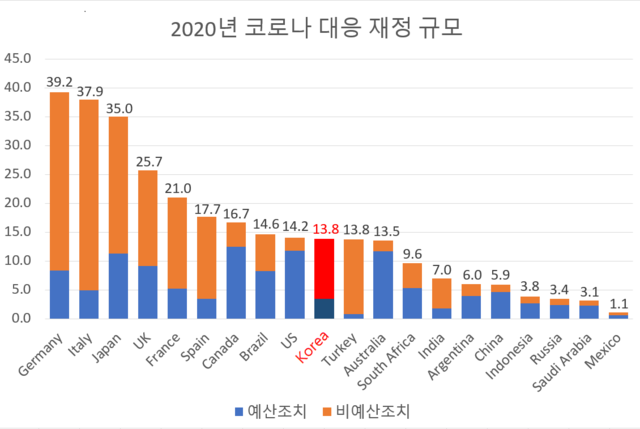 2020년 10월에 발표된 IMF의 ‘코로나 대응 재정’ 보고서에 따르면 우리나라는 코로나 대응 재정규모가 GDP 대비 13.8%로 G20 국가 중 터키와 함께 공동 10위를 기록하고 있다. 가장 많이 집행한 국가는 독일(39.2%), 이탈리아(37.9%), 일본(35.0%) 순이다.