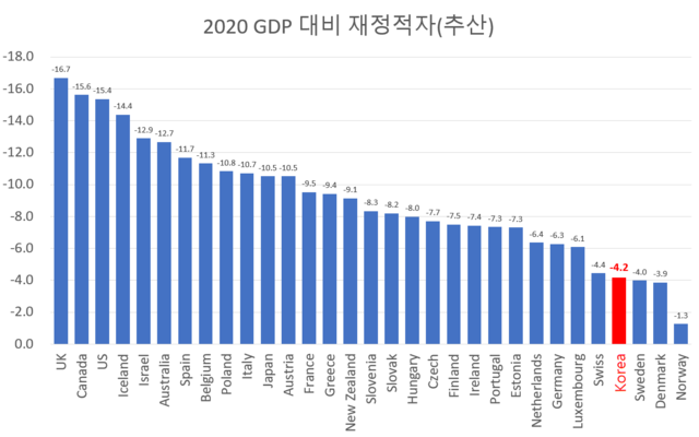 이런 결과로 전세계가 막대한 재정을 지출하고 있는 코로나 팬데믹 국면에서 우리나라의 2020년 재정적자 예측치는 GDP 대비 –4.2%로 OECD 31개국 중 28위에 해당한다. 이를 두고 어떤 보수언론은 "韓 올해 재정적자, 선진국 중 최소 수준"이라며 보도했다. 그래서 잘 했다는 얘기다.