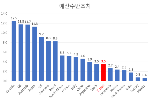 G20 국가 중 가장 많은 코로나 대응 예산을 투입한 나라는 캐나다(12.5%), 미국(11.8%), 호주(11.7%), 일본(11.3%) 순이다. 우리나라보다 예산을 적게 쓴 나라는 인도네시아(2.7%), 러시아(2.4%), 사우디아라비아(2.3%), 인도(1.8%), 터키(0.8%), 멕시코(0.6%) 등이다.