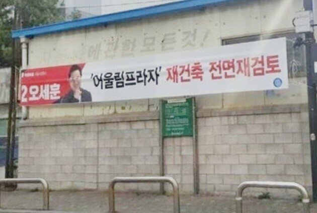 | ▲ 오세훈 국민의힘 서울시장 후보가 강서구 일원에 내건 "어울림플라자 재건축 전면재검토" 공약 현수막 |