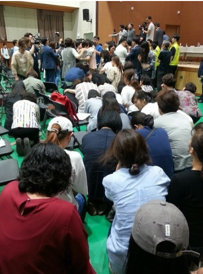 | ▲ 2017년 9월 5일 서울 강서구 탑산초등학교에서 열린 '강서지역 공립 특수학교 신설을 위한 주민토론회'에서 특수학교 설립을 두고 찬반 주민들의 의견이 엇갈리자 장애아동 학부모들이 무릎을 꿇고 호소하고 있다./서울장애인부모연대 페이스북 |
