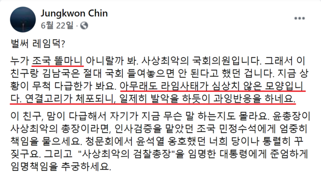 “누가 조국 똘마니 아니랄까 봐. 사상최악의 국회의원입니다. 그래서 이 친구(김용민 의원)랑 김남국은 절대 국회에 들여놓으면 안 된다고 했던 겁니다. 지금 상황이 무척 다급한가 봐요. 아무래도 라임사태가 심상치 않은 모양입니다. 연결고리가 체포되니, 발악을 하듯이 과잉반응을 하네요.”