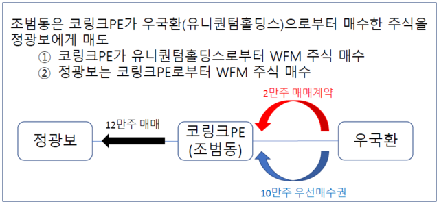 미공개중요정보이용은 우국환이 보유한 WFM 주식을 코링크PE가 매수하고 이것을 정광보 씨에게 매각한 것이므로, 거래 경로에 있어서 코링크PE를 거친 것으로 보고 ‘사모펀드 혐의’ 관련이라고 할 수 있을지도 모른다. 그러나 이마저도 무죄 판결을 받았다.