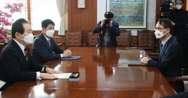 | ▲ 정세균 국무총리(왼쪽 첫 번째)가 8일 정부서울청사 집무실에서 초대 국수본부장으로 임명된 남구준 본부장(오른쪽)에게 정부합동특별수사본부 확대 개편을 지시하고 있다. 2021.3.8 |