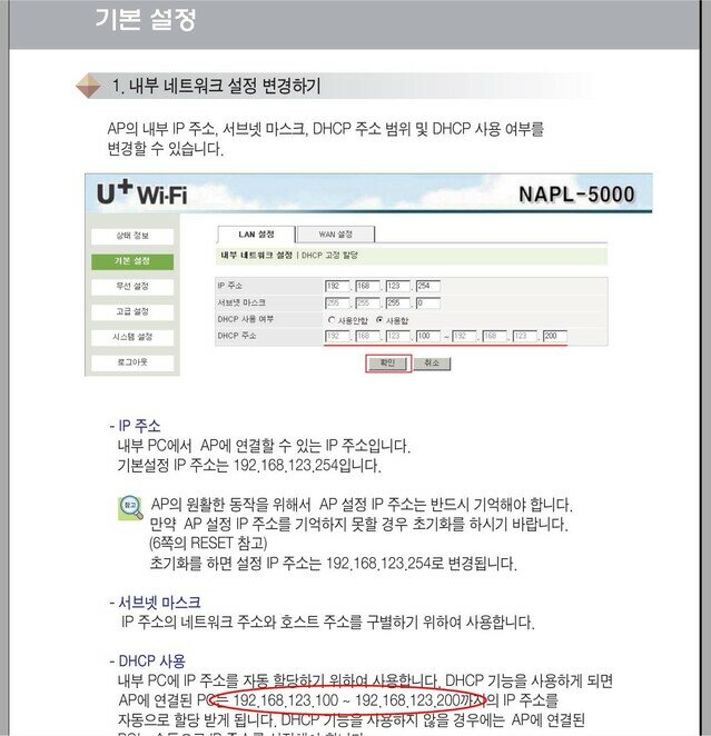 | ▲ LG U+ NAPL-5000의 설명. PC에 192.168.123.100~192.168.123.200까지의 IP를 할당한다는 설명이 기재돼있다. |