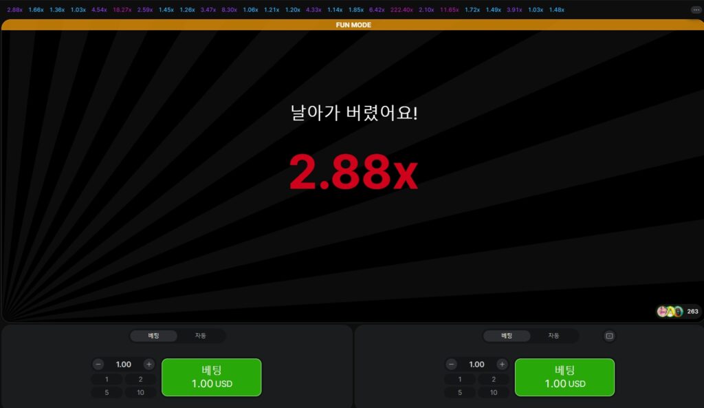 라운드가 시작되면 모든 시선이 상승하는 배수에 집중됩니다. 언제든 캐시아웃을 선택할 수 있지만, 비행기가 사라지기 전에 ‘최적의 타이밍’을 잡는 것이 관건입니다.