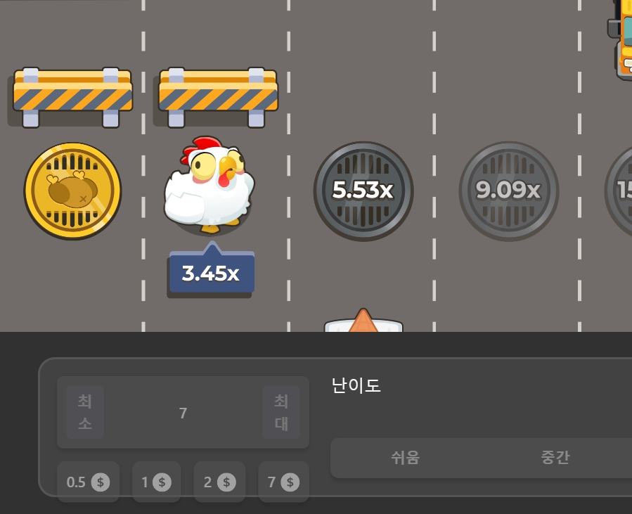 - 🐣 Easy: 위험이 거의 없으며 최대 30칸 이동 가능. 안정적이지만 보상은 낮음.