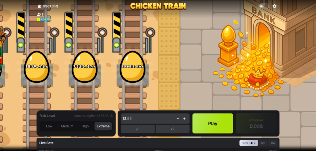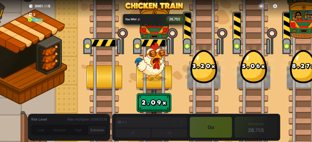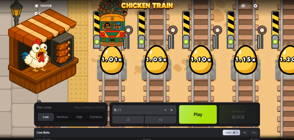 Chicken vs Train의 큰 매력은 다양한 난이도 레벨에 있습니다. 누구나 자신의 취향에 맞게 경험을 조절할 수 있죠. 신중한 플레이를 선호하든, 최대 아드레날린을 원하든, 총 네 가지 설정이 ‘안전한 스텝 수’와 ‘가능한 배수’를 조정해 주며, 플레이어가 원하는 리스크 수준을 직접 선택할 수 있습니다.