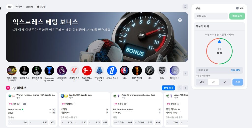 라이브 및 인플레이 베팅은 실시간 경기 흐름을 보며 동적으로 베팅할 수 있어 추가적인 재미를 제공합니다. 다가오는 경기는 이벤트 섹션에 강조 표시되며, 라이브 탭에서는 현재 진행 중인 경기와 스트리밍 및 즉시 베팅이 가능한 매치를 보여줍니다. 여러 스포츠에서 꾸준히 경쟁력 있는 배당률을 제공해, 업계 평균 대비 잠재적인 수익 극대화에 도움을 줍니다.